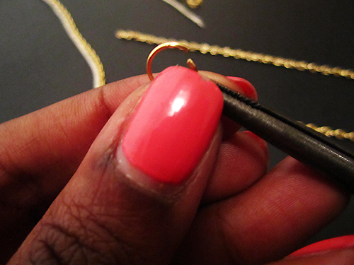 Take the gold chain neck piece put each end through the jump ring, also add one end of your charm to the same jump ring. Close the jump ring with your pliers.