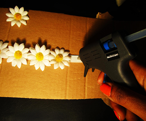Place the cardboard or scrap fabric down. Line up your flowers on the elastic.