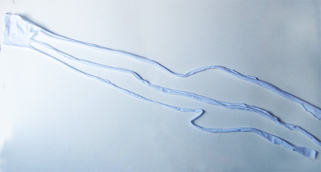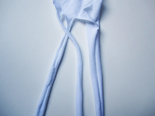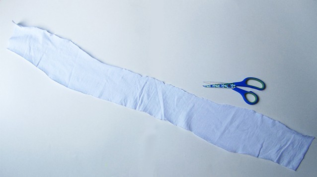 Cut the piece into 3 strips leaving about 2 inches of material at the top. Stretch each strip by pulling on the material.
